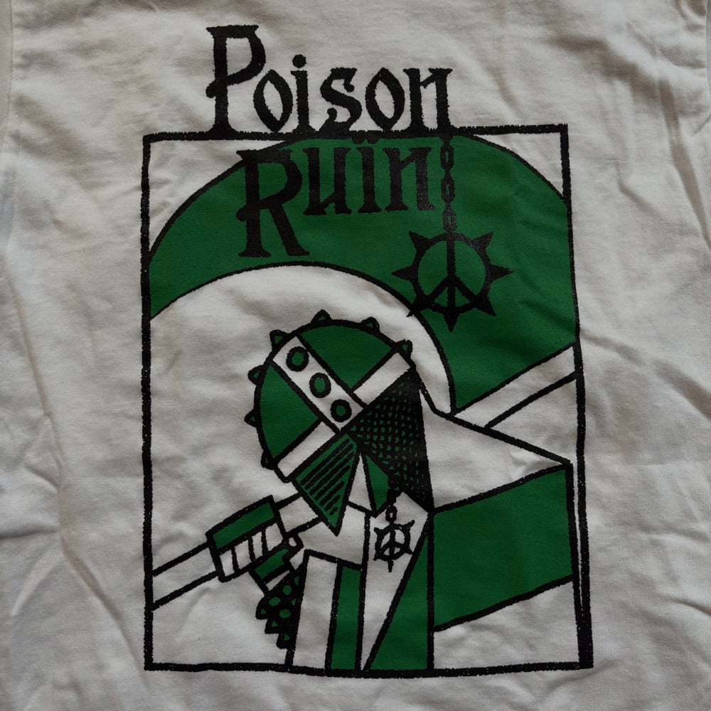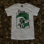 Screen printed in black and green ink on a white Gildan heavy cotton tee.